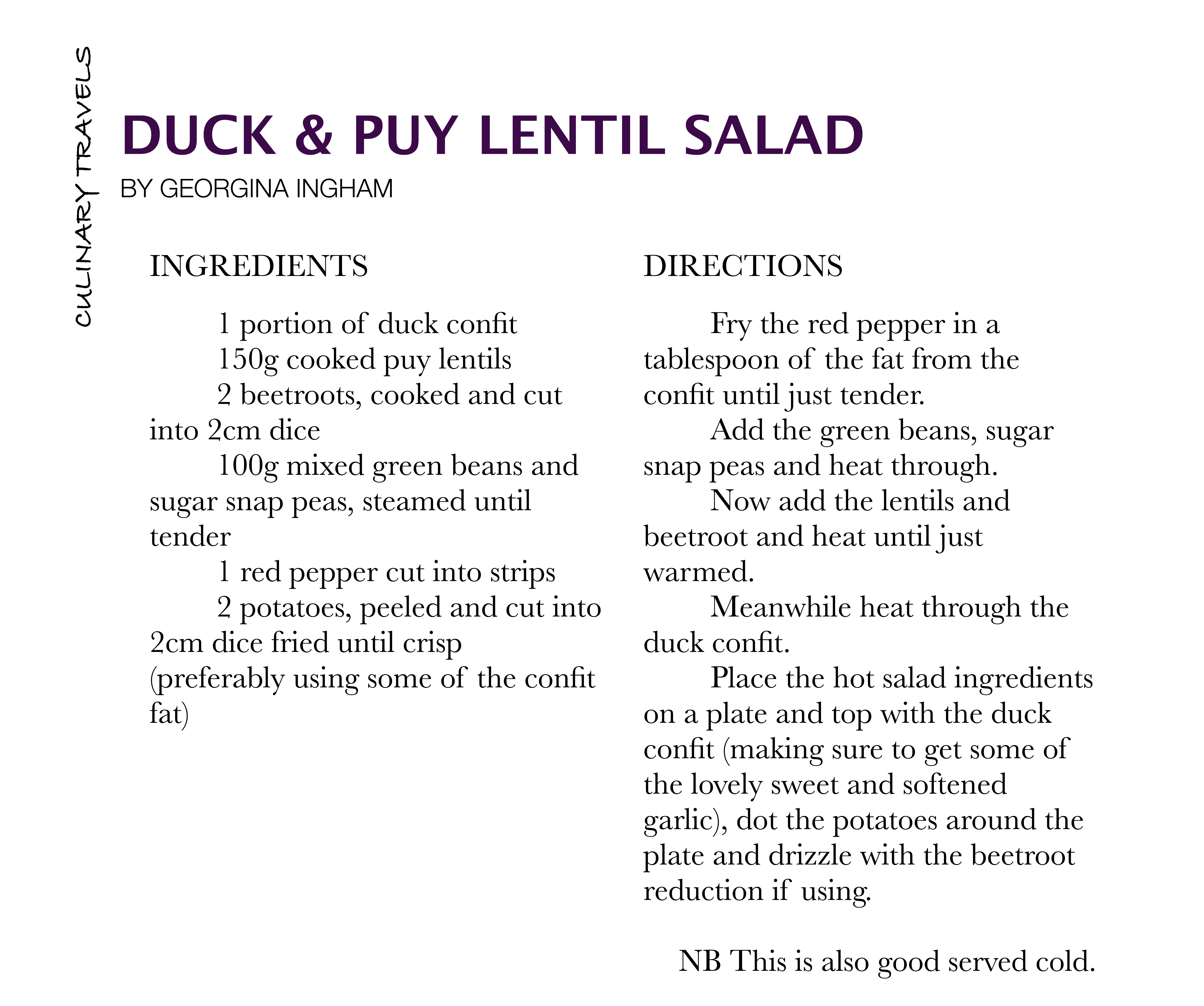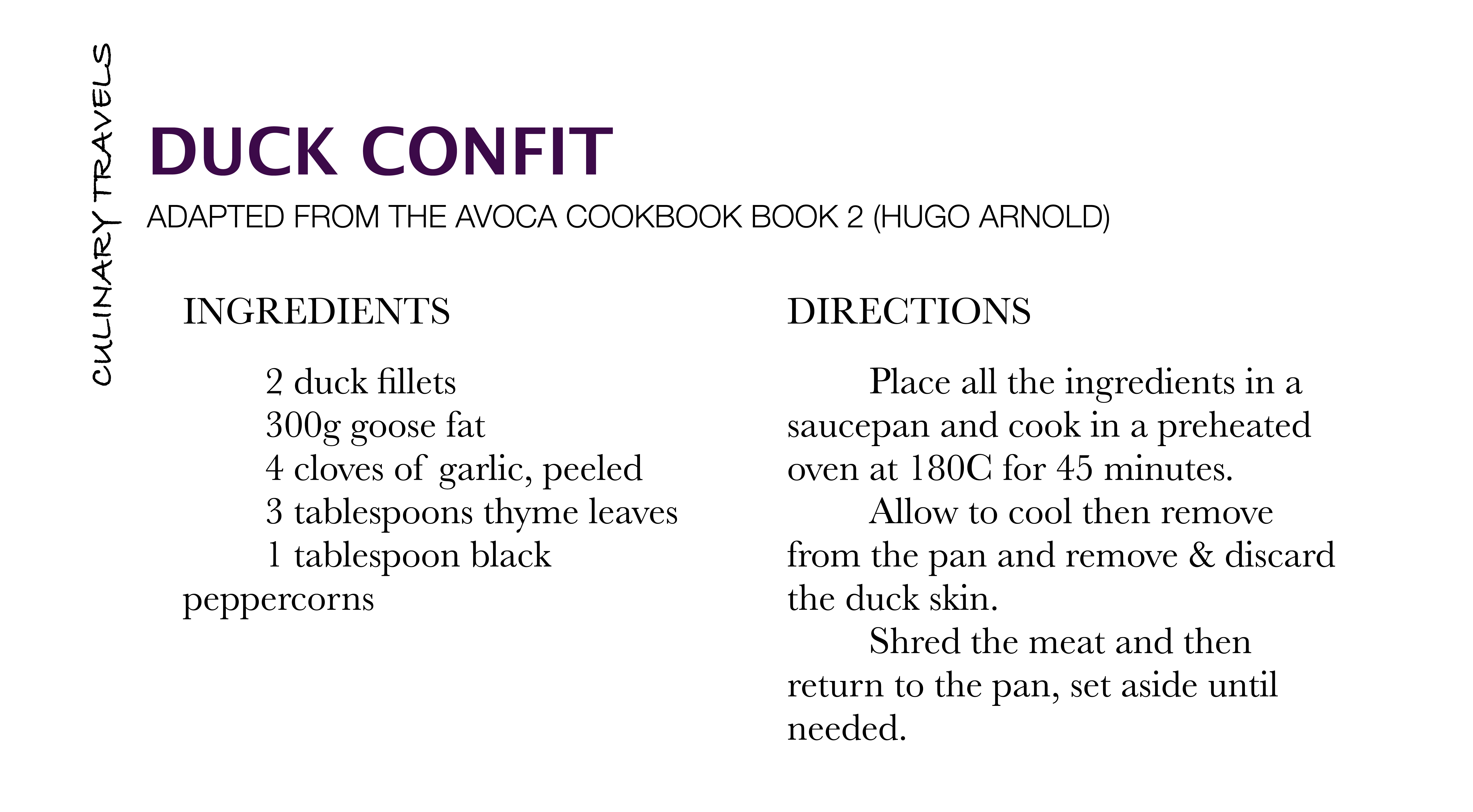 The duck confit recipe was adapted from The Avoca Cookbook Book 2 (Hugo Arnold) which is an absolute delight of a book which focuses on simplicity and goodness in rather exciting variants, simple food paired up well and sometimes with a little ‘razzle dazzle’ for when something a wee bit special is required. The puy lentil salad is of my own making.