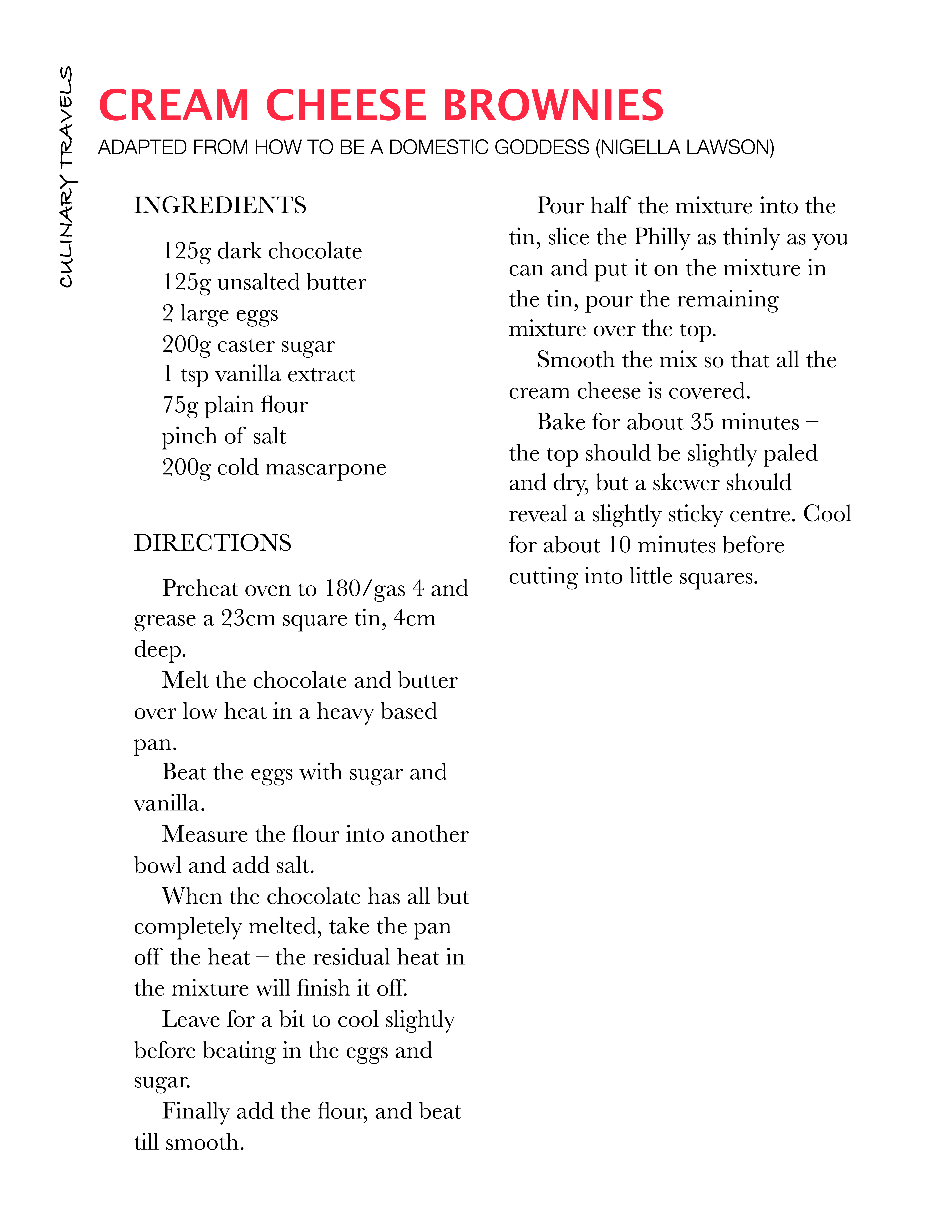 Along with many of my forum friends I am passionate about brownies and I always on the lookout for a new recipe to try. The fact that this particular recipe for the cream cheese variety had so many poor reviews just spurred me on. The combination of sweet and savory in a brownie – it was either going to be fabulous or totally disgusting, but I have to admit I trust Nigella’s judgement and jumped (metaphorically speaking of course) straight into the recipe with both feet.