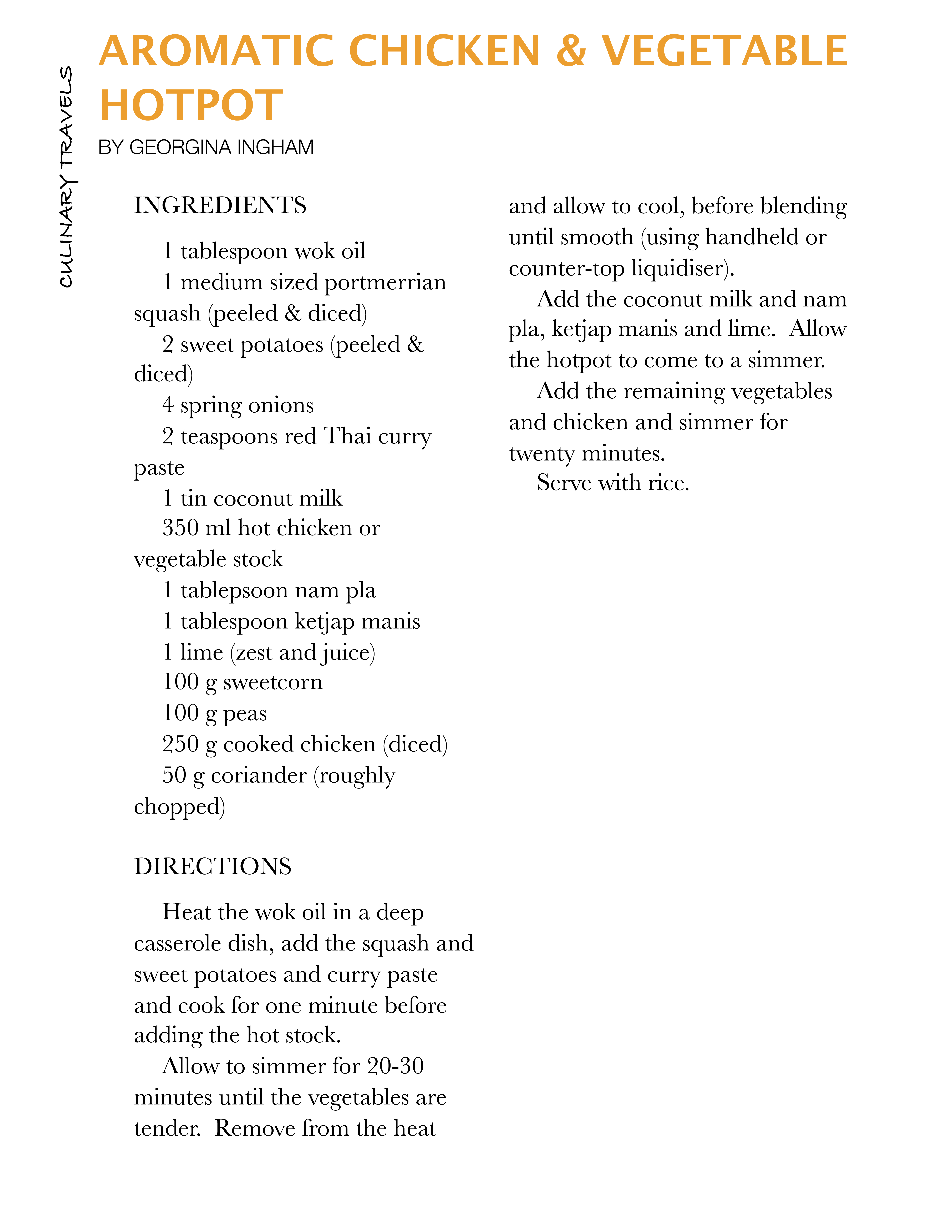 The result was a Thai inspired Chicken & Vegetable Hotpot made from portmerrian squash, sweet potatoes, spring onions, peas, sweetcorn, left over roast chicken and a few herbs, spices and Thai essentials.