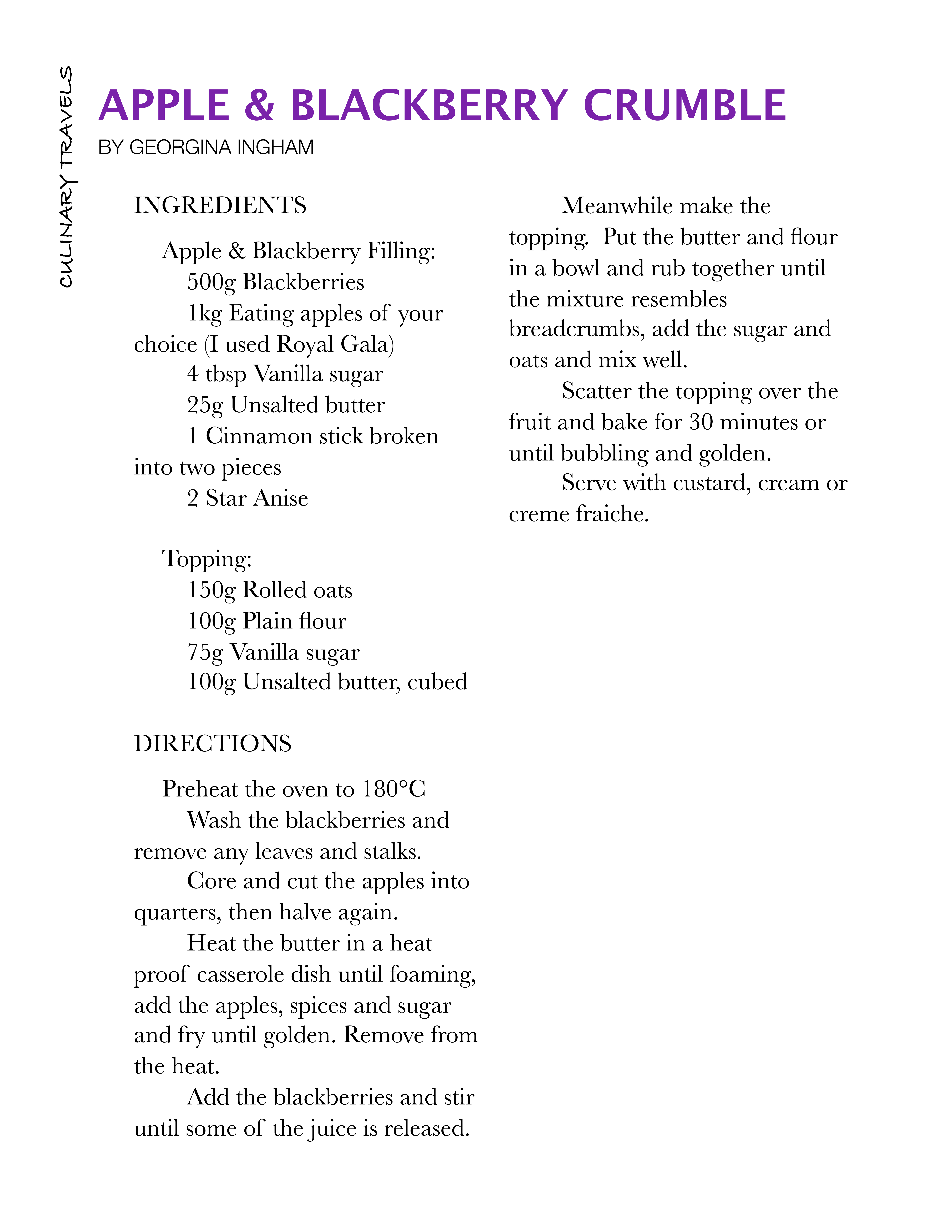 I fried the apple slices in a little butter and sugar (to which I’d added a cinnamon stick and two star anise) until tinged with gold. The spices really added an extra warmth to the finished dish, a warmth that radiated from within not just from the temperature of the crumble, a tongue tingling warmth; delicious! The blackberries weren’t pre-cooked, I just tipped them into the still warm apples and stirred them round to release some of their deep purple juice.