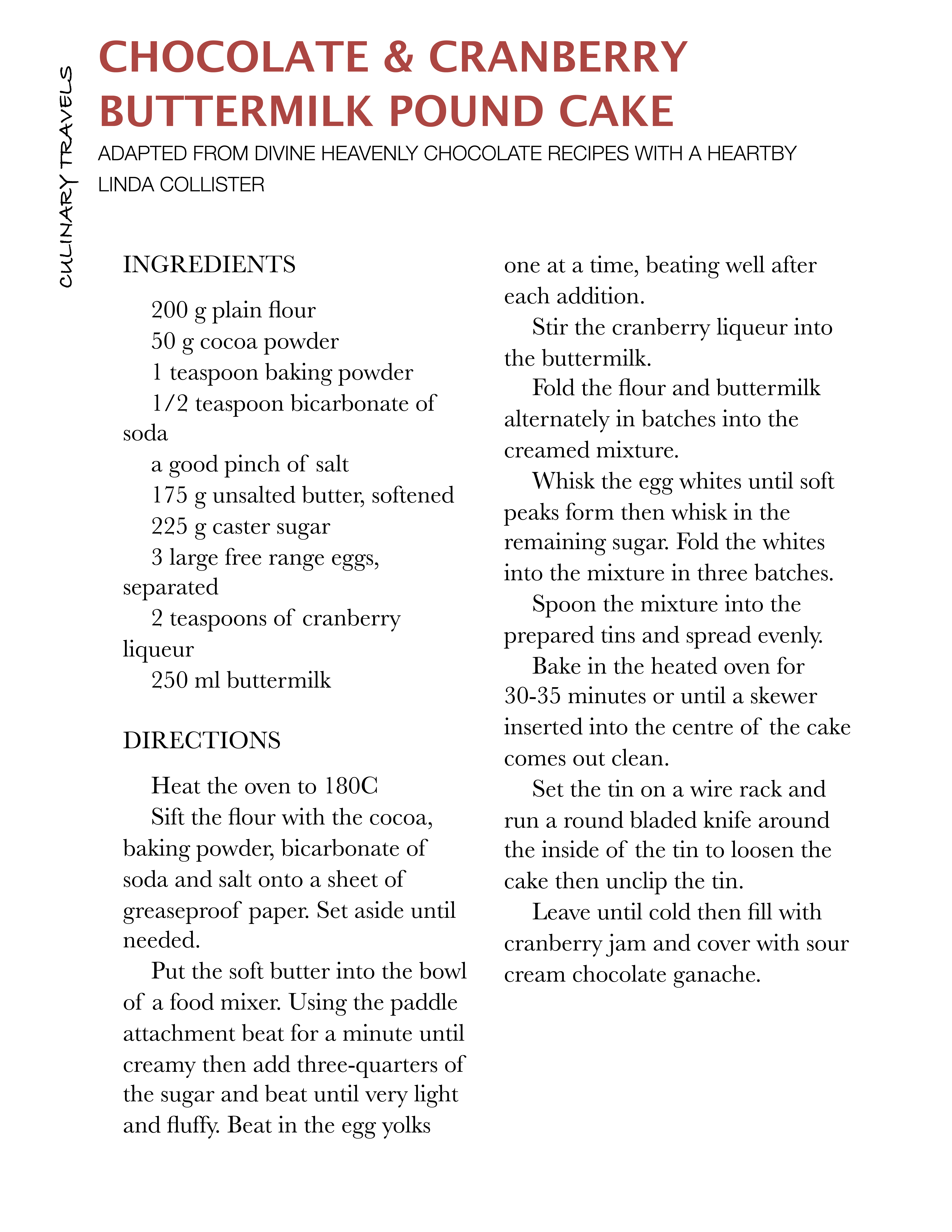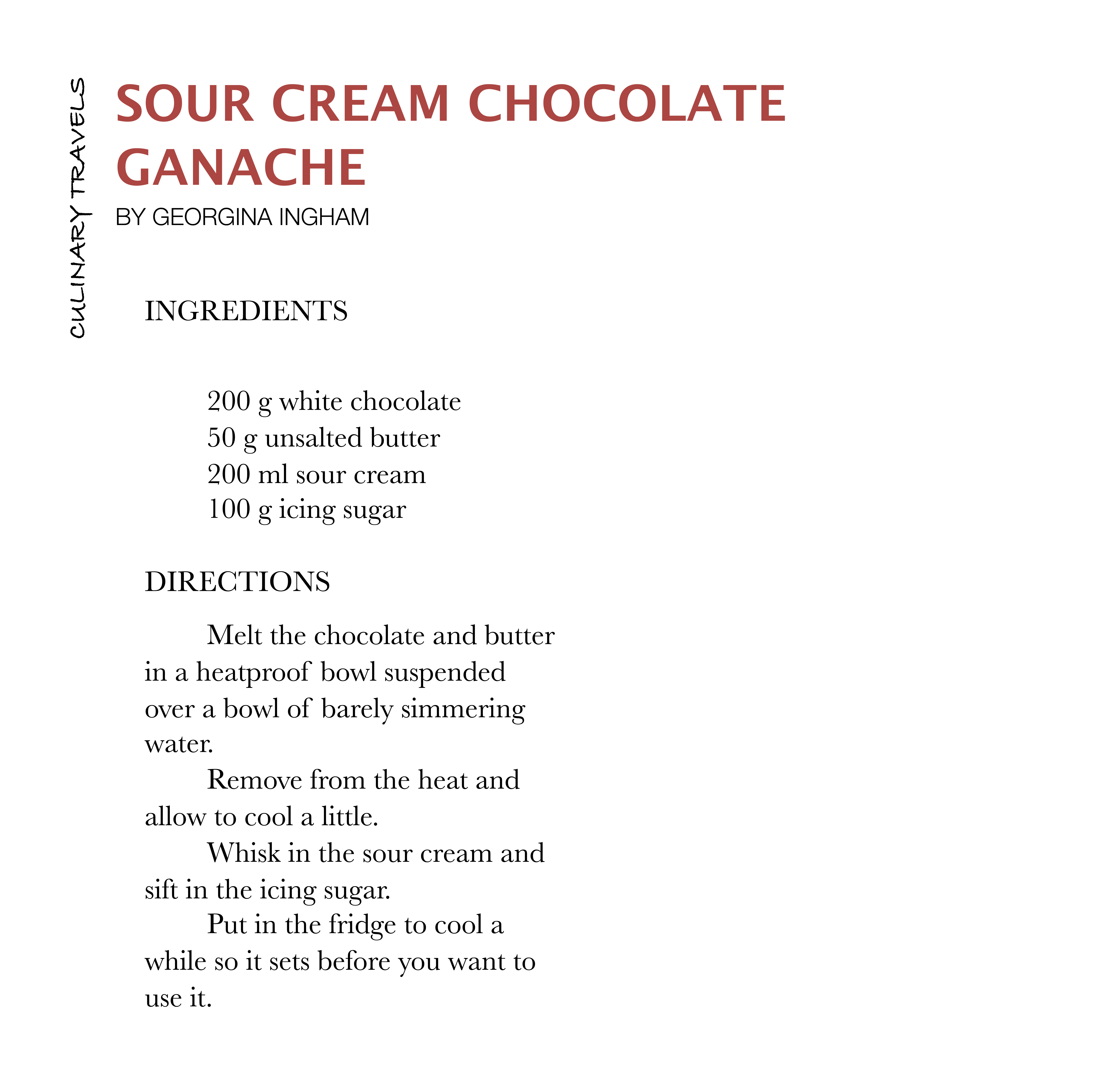 As Collister states the buttermilk leads to a moist crumb and gives a slight tang to the cake. I worked on this by adding a sour cream chocolate ganache topping and instead of baking the cake in one 23cm spring-clip tin as directed I baked it in two 20cm sandwich tins, layering them with a little of the ganache and homemade cranberry preserve. Although cranberries are more usually associated with white chocolate, their slight sharpness and shimmering ruby colour really lends itself to the bitterness of dark chocolate.