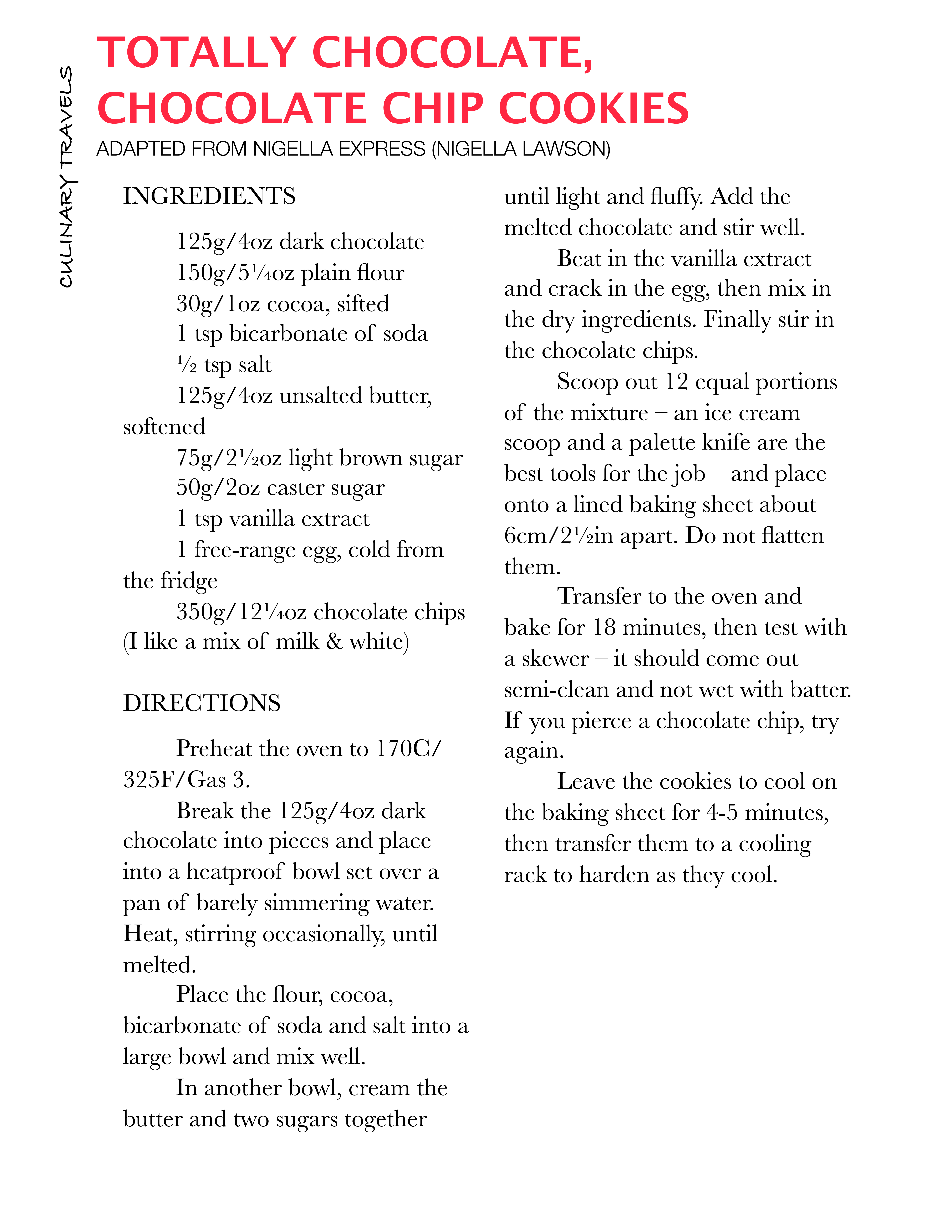 The store is reportedly a favourite of Nigella Lawson and it was with this in mind that I began to plan the cocoas unveiling. As you can tell from my earlier posts this month I’ve made rather a lot of cakes, so cookies it had to be. Chocolaty, gooey but crisp cookies. I toyed with the idea of the Chocolate Mint Cookies but I didn’t want the flavour of the D&D cocoa to be interfered with too much, for pure unadulterated chocolate, it had to be the Totally Chocolate, Chocolate Chip Cookies from Nigella Express (Nigella Lawson).