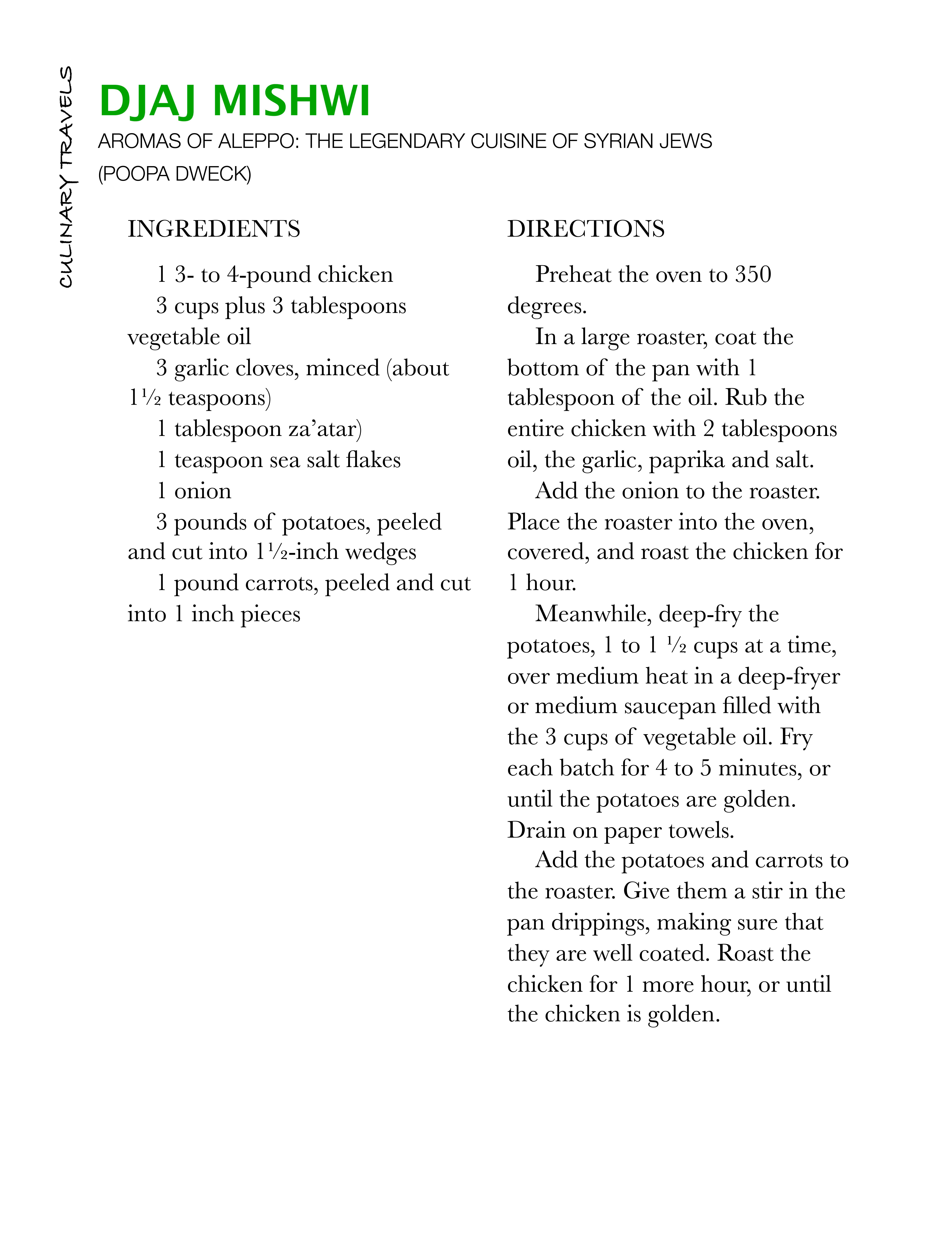 Another meal from the delightful Aromas of Aleppo: The Legendary Cuisine of Syrian Jews (Poopa Dweck), Djaj Mishwi (translated into English this means Friday Night Chicken, but that doesn’t sound anywhere near as enticing does it?).