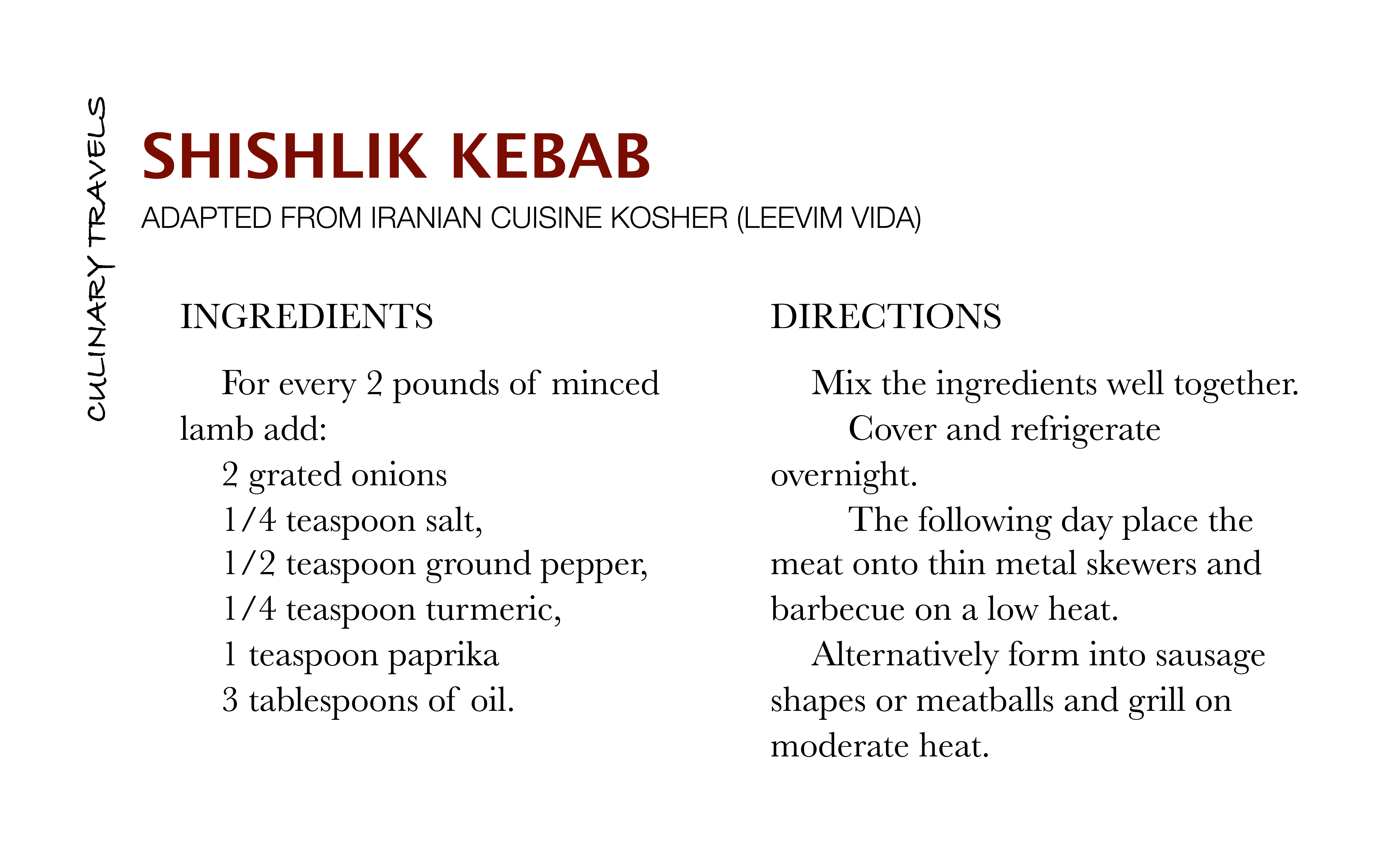 The Shishlik stood out as an essential to be cooked right away, despite the fact that I couldn’t barbeque it over hot coals as requested in the recipe. Even though they were just simply grilled, they were amazing. I used finely diced lamb and it was so moist, almost crunchy on the outside, delicious.