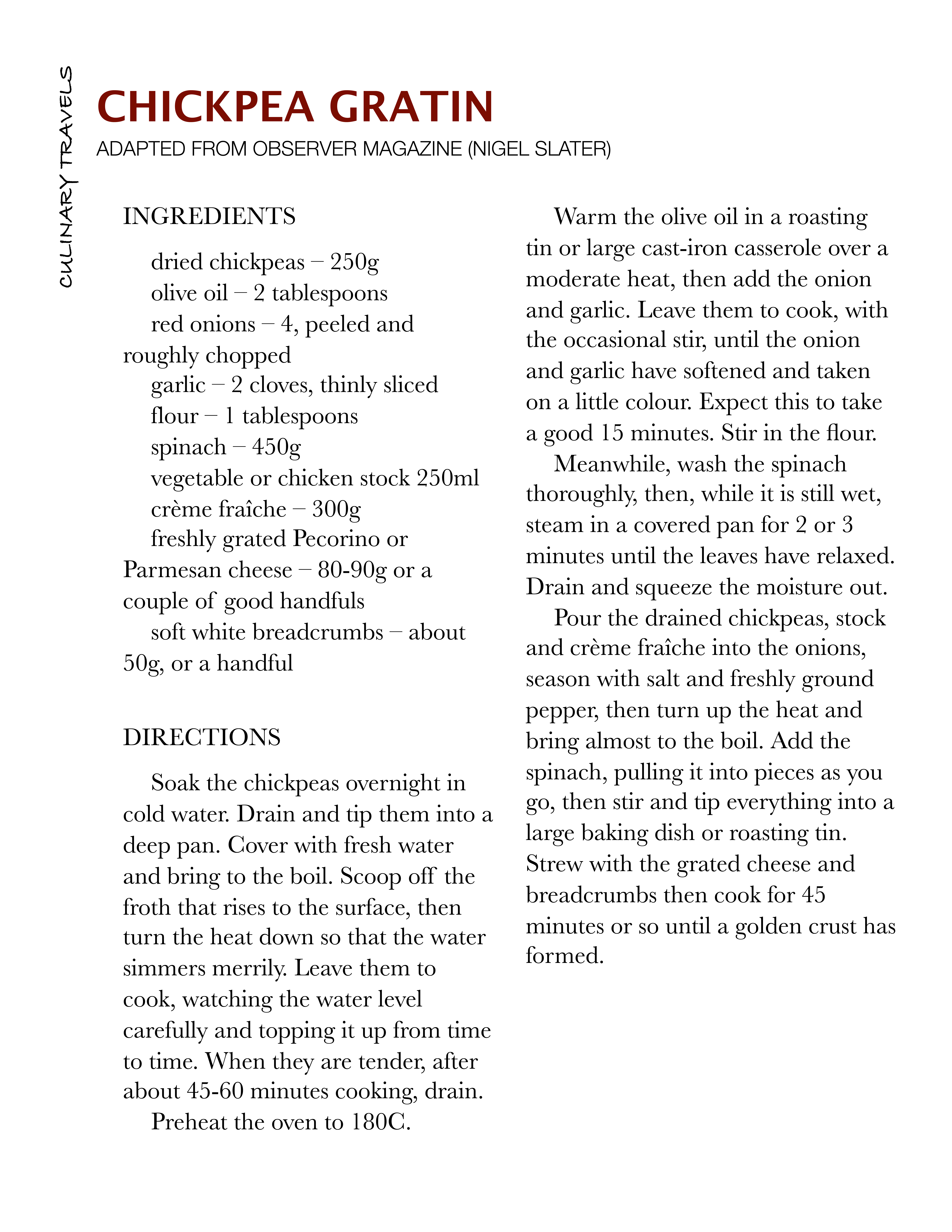 How did Jules contribute? Well in a double act with Nigel Slater to be precise. Nigel had a fabulous sounding recipe for chickpea and spinach gratin in this months Observer Food Monthly and Jules had just sent me a big bag of chickpeas, this just had to be cooked. I didn’t have any spinach left from yesterday so I substituted it for a finely diced red pepper, to add both colour and flavour. Nigel suggests that this gratin could be a main course, I disagree, I don’t think there is enough depth to it for a whole meal, stunning as a side dish but that’s about as far as it could go.