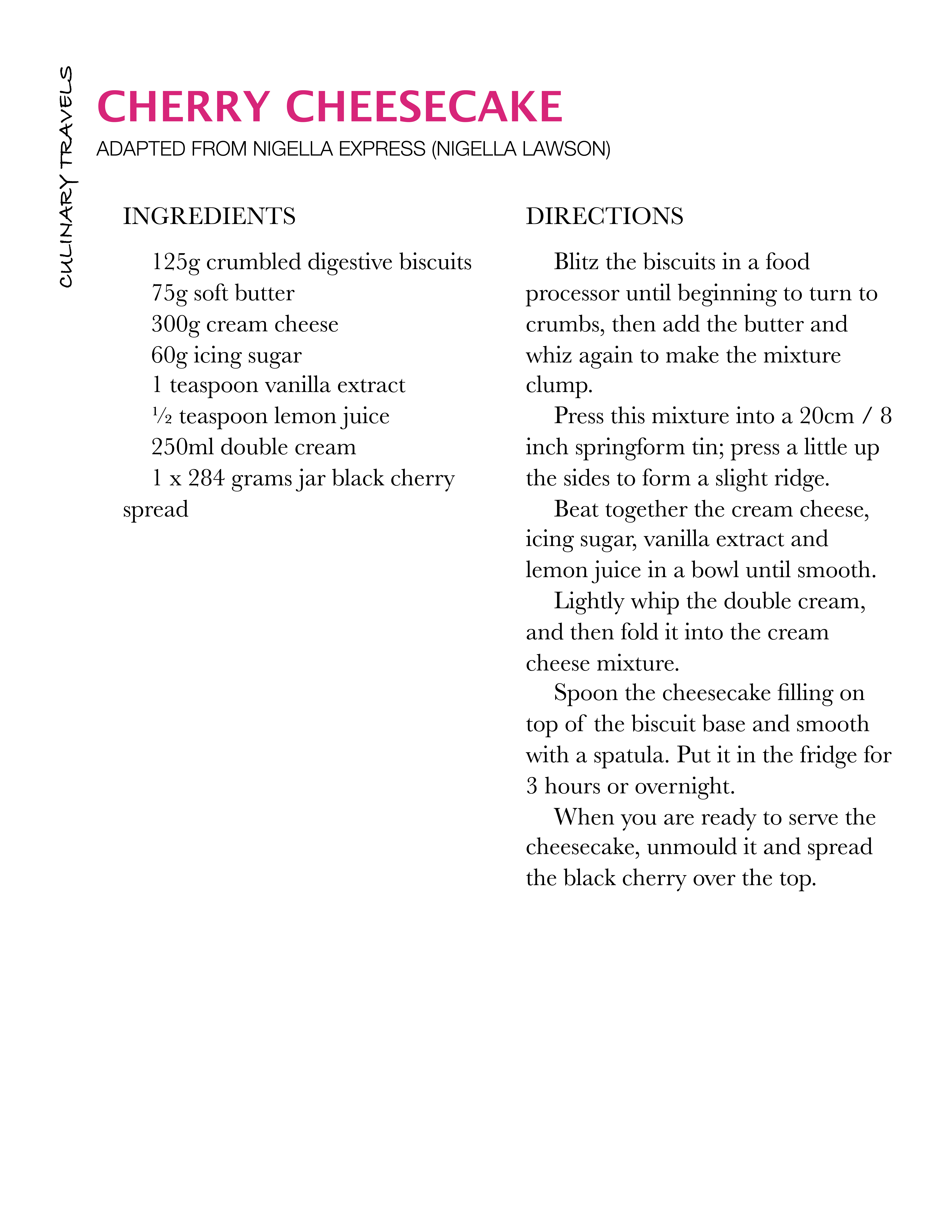This cheesecake is unbaked, I usually would go for the baked variety, believing they are lighter and better in texture but I just didn’t have the hours in the day this time around. I was pleasantly surprised by the nature of unbaked variety, very creamy and rich but the sharpness of the cherries offset that nicely.