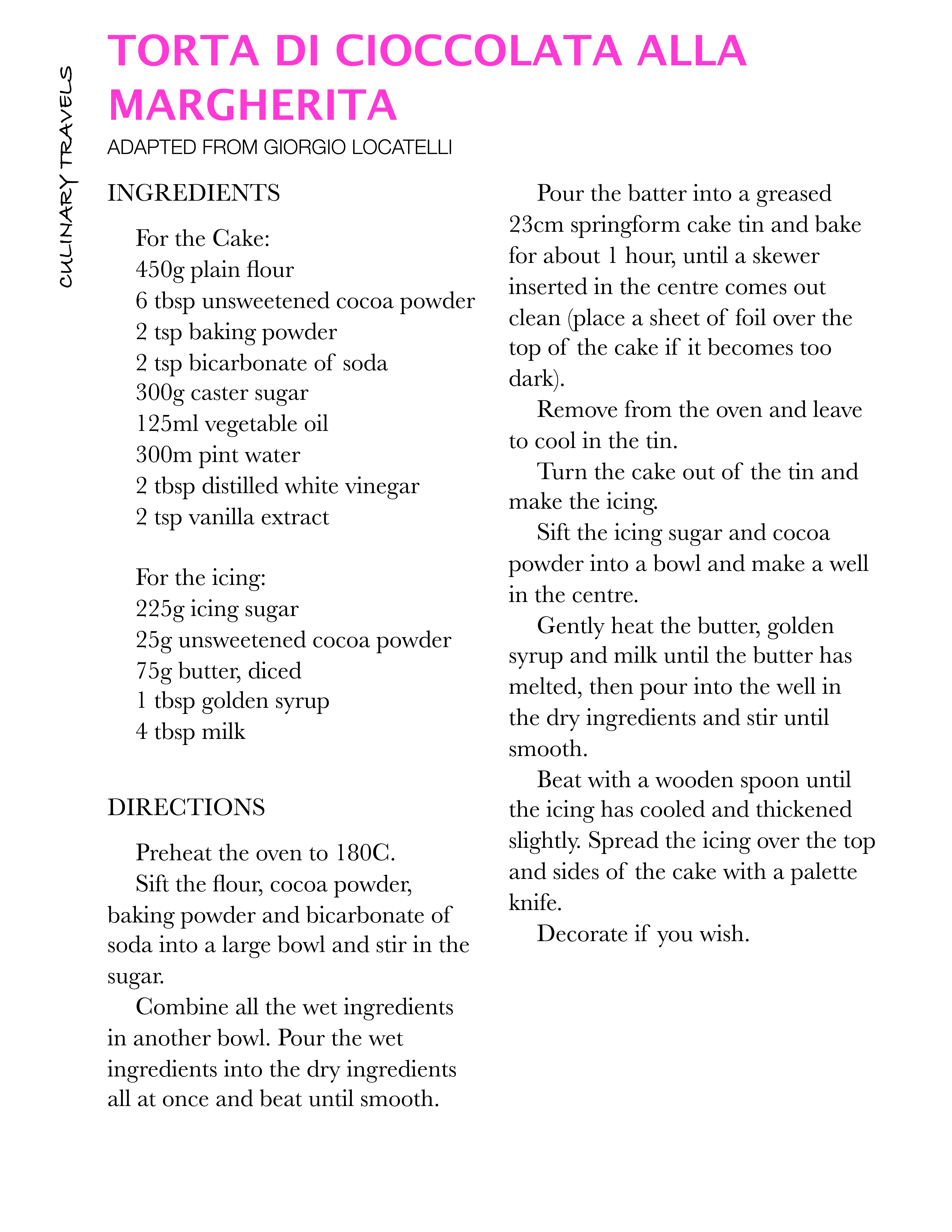 Giorgio developed this cake for his daughter Margherita (who has a severe egg allergy amongst others), hence the Italian name for this cake is Torta di cioccolata alla Margherita.