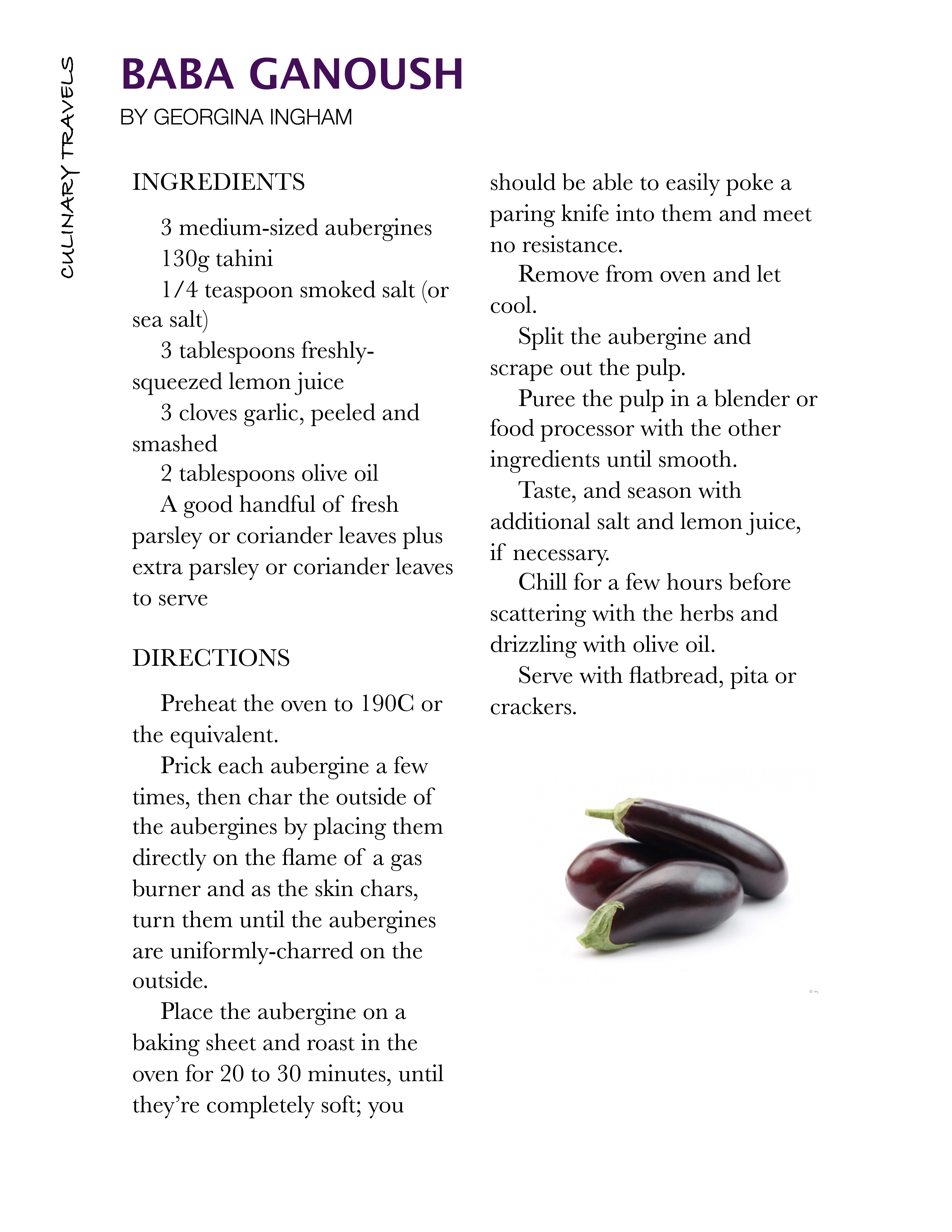 Baba ganoush is a Lebanese dish of aubergine, mashed and mixed with virgin olive oil and various seasonings. I suppose you could say it’s the lesser known cousin of hummus, only instead of chickpeas you have aubergine.