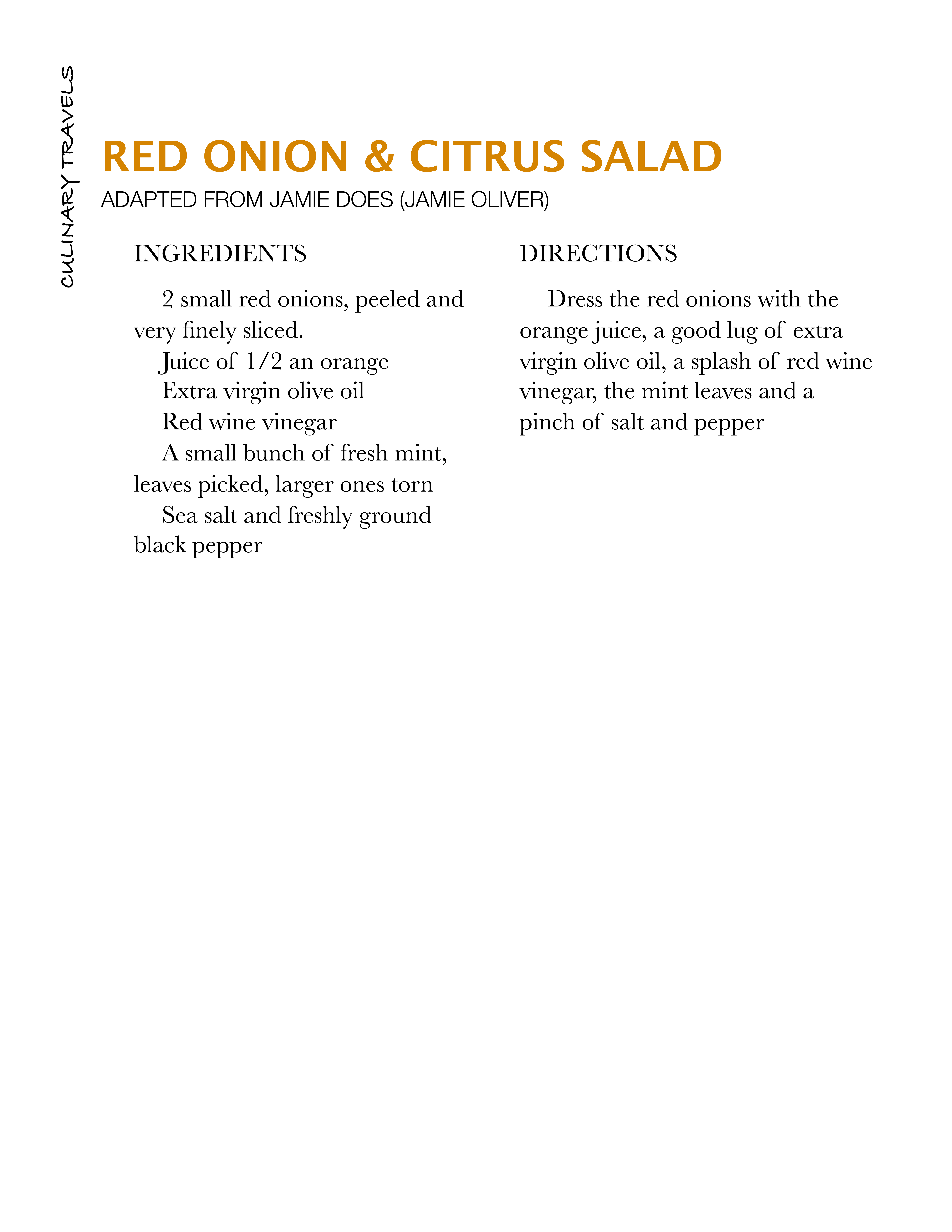 In a very lapse moment I forgot to order my carrots for the salad so substituted them for red onions. What a great move that proved to be. Sweet, wafer thin slices of onion in a heady bath of tangy citrus juice, red wine vinegar and superb light but peppery Tunisian olive oil made the perfect accompaniment to the chicken.