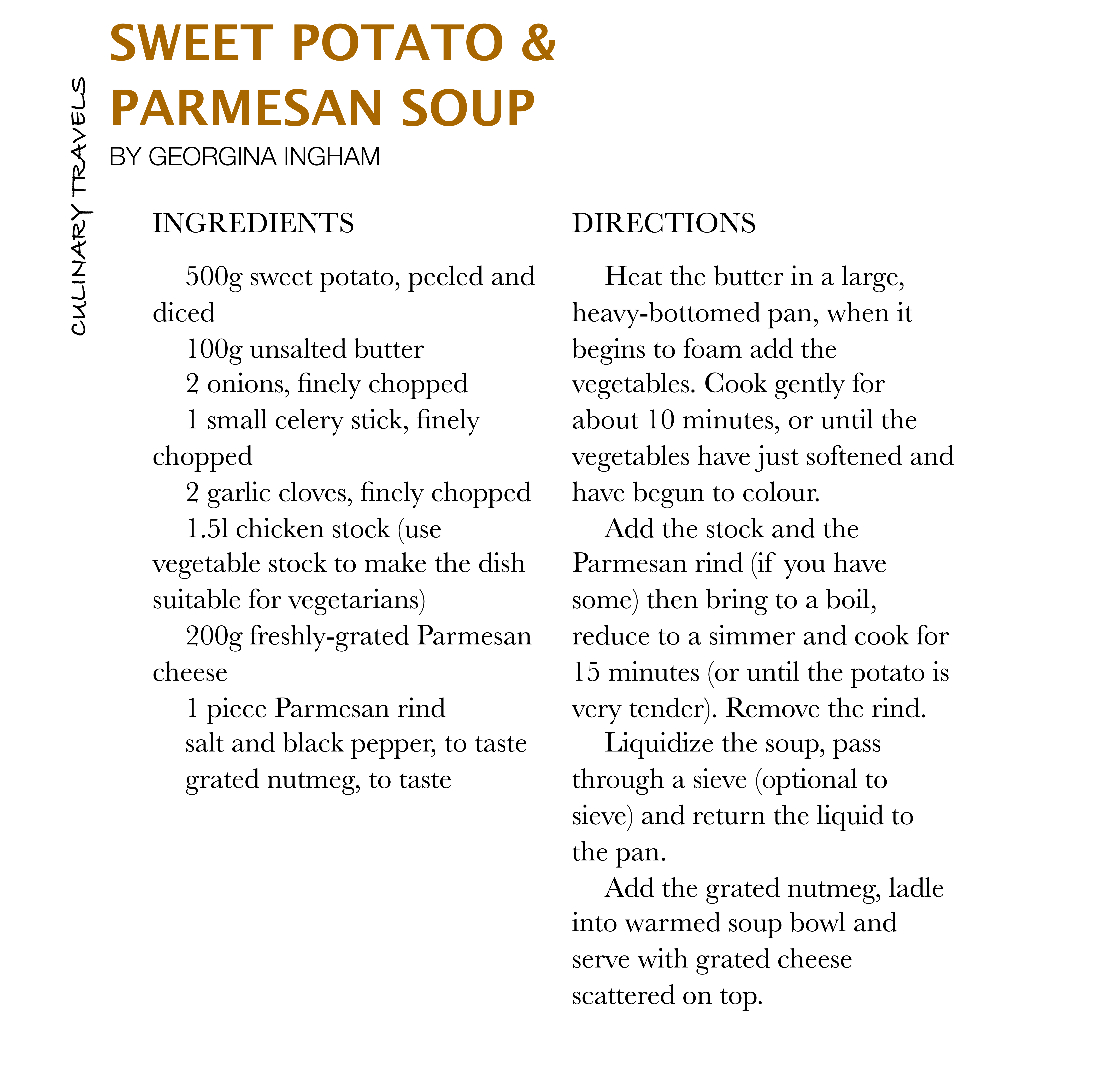 Here, the Parmesan rind is simmered with chicken stock and naturally sweet sauteed onions and sweet potatoes to create a soup rich in flavour.