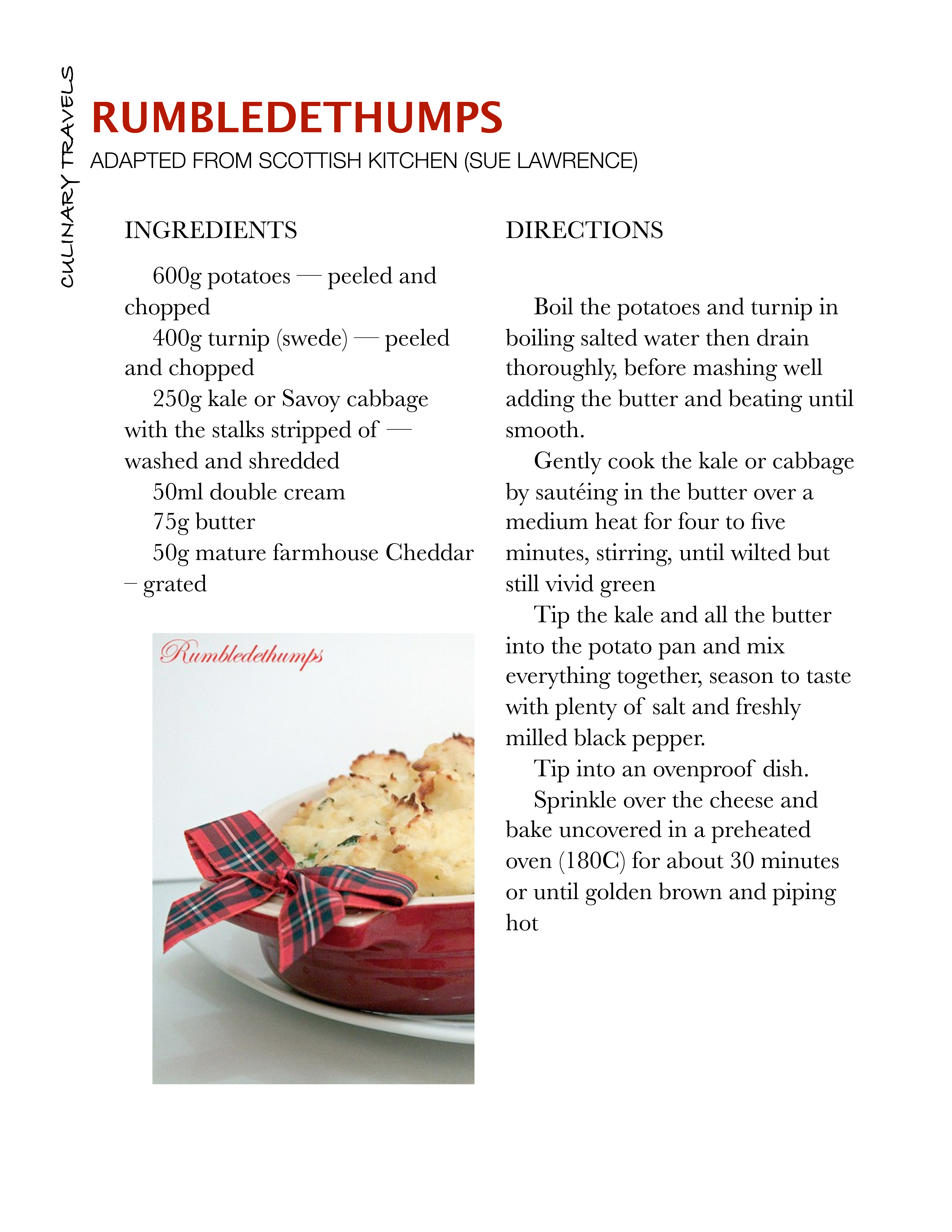 The name rumbledethumps apparently comes from the noise made in the kitchen as the tatties and cabbage are rumbled and thumped in the preparation.