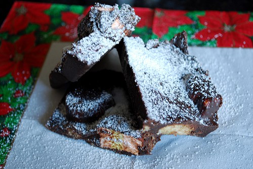 This festive version takes a slightly more elegant turn with it’s inclusion of amaretti biscotti instead of the more traditional digestive style biscuits but it still contained the typical dried fruits and nuts. I made a couple of changes to the recipe, including dried chocolate coated cranberries and chocolate coated cherries instead of glace ones and I didn’t add nuts at the request of my mum.