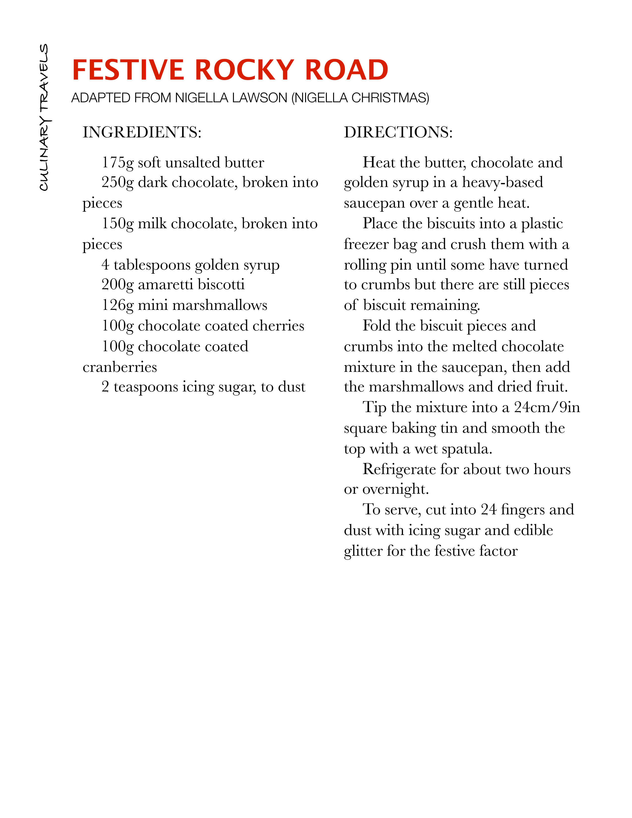 When Nigella Lawson’s new book Nigella Christmas: Food, Family, Friends, Festivities arrived I sat with a steaming cup of tea and read through the book, ooohing and mmming over all the delightful recipes with notepad and pen to hand jotting down all the must makes for the festive season but when it came to the rocky road slice I couldn’t wait until December, I had to make it right now; so I did.