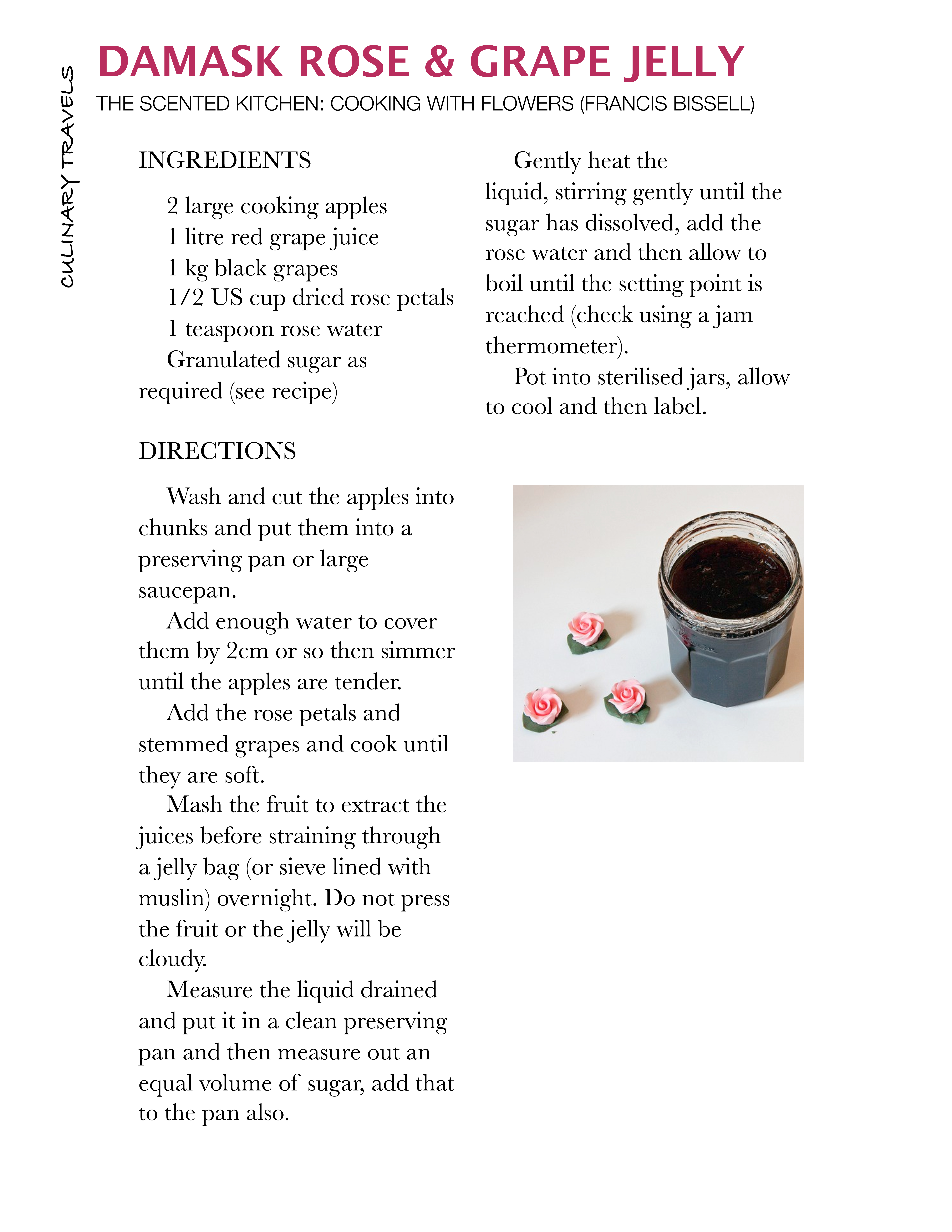 My recipe from this book was the Damask Rose and Black Muscatel Grape Jelly. The black grapes lend a sultry, dark red colour and the rose petals a truly amazing flavour; very fresh and vibrant indeed. I did have to make a few adjustments though because of a lack of ingredients, my version of the recipe will be found at the end of the post.