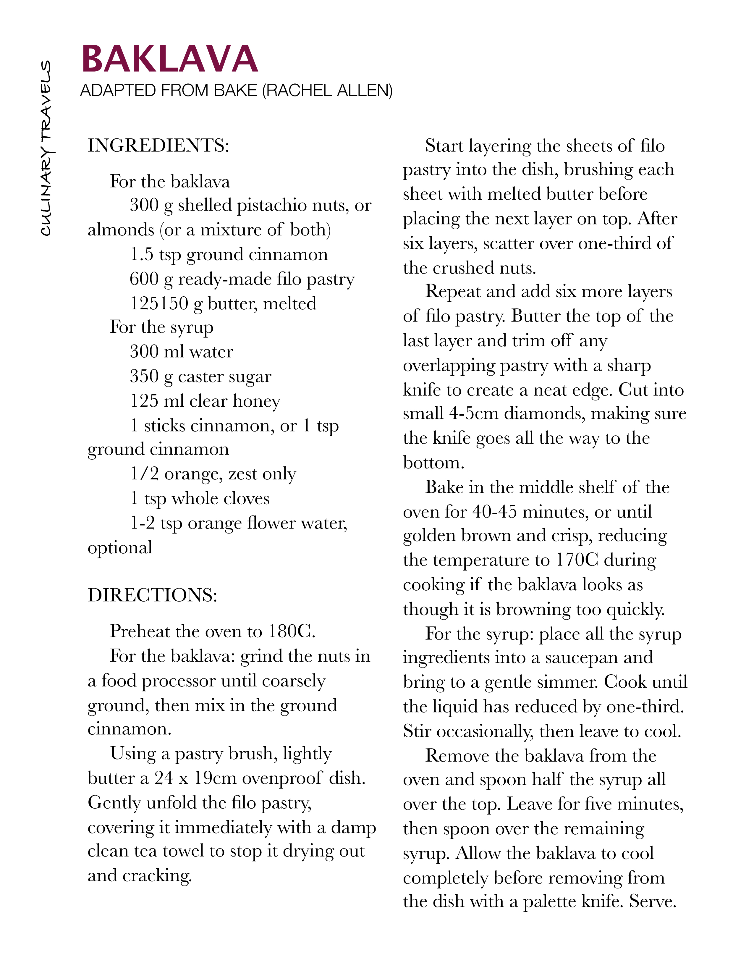 I’d half a pack of filo dough leftover from making some party nibbles over Christmas and after a quick scan of Rachel’s Baking Secrets: From Cookies to Casseroles, Fresh from the Oven (Rachel Allen), I decided to go with a sweet treat – Baklava! I’ve eaten baklava several times while on holiday both in Turkey and Greece, it is a love or hate food I think and I happen to love it. I’ve only once made it before at home and it was rather a disaster but this time it worked out perfectly — crisp pastry encasing melt in the mouth, sweet, flavoursome nuts. I did make one change to the recipe, to use up a jar of chestnuts I added them to the nut mix, pistachio and chestnut is a fabulous combination, one I had to make a note of repeating again; the sweetness of the chestnuts against the slightly salty edge of the pistachios worked a treat.