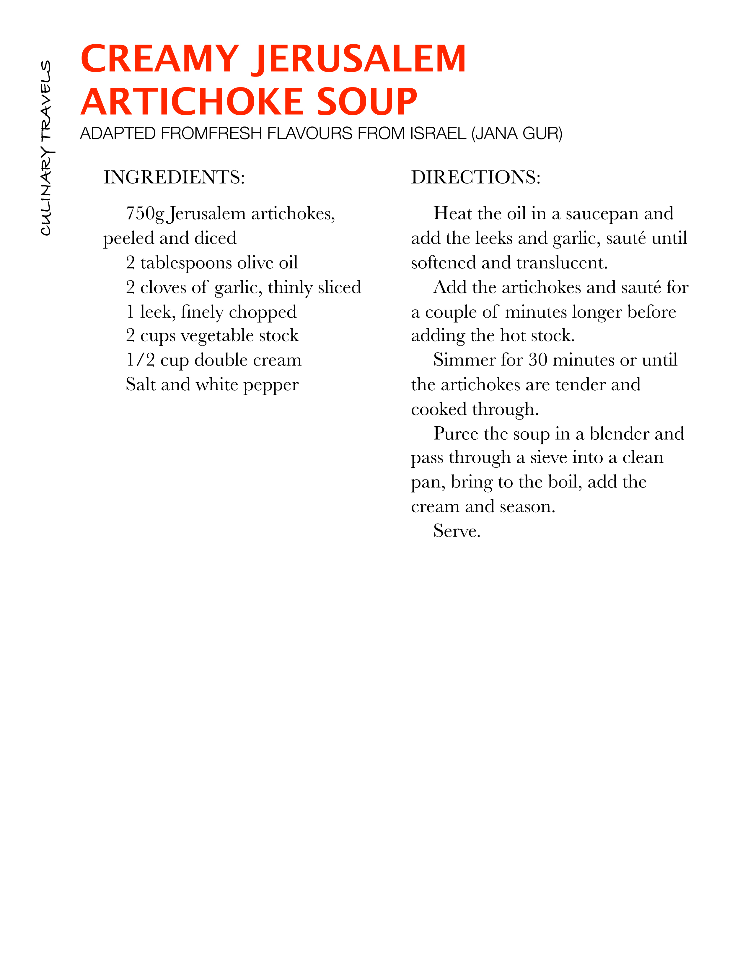 After gaining some thoughts and insight on what is best to do with the strange looking vegetable from my friends on a food forum I frequent I decided to go with a soup, after all the weather here is bitterly cold and frosty, just the kind of day you need a lovely warming cup of soup for lunch. The recipe came from Fresh Flavours from Israel by Jana Gur, a lovely book sent to me by the ever thoughtful Francesca.