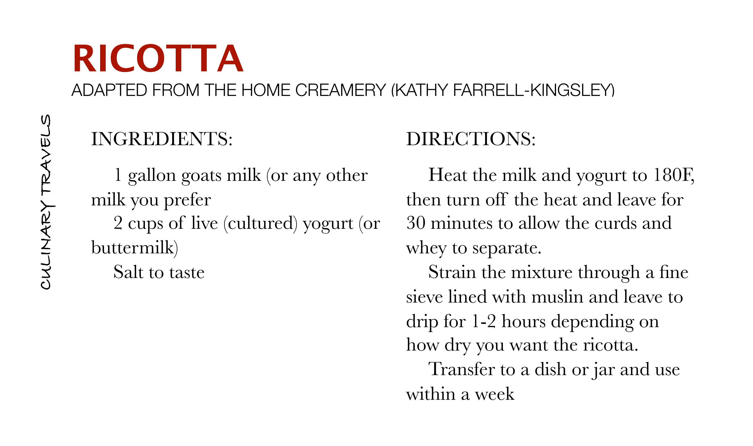Ricotta literally means recooked and this refers to the fact that ricotta is traditionally made from the whey left over from cheese-making, however for those of us without access to cheese-making by products, delicious fresh ricotta can also be made by using readily available milk, cows, sheep and goats milk would all work well either on their own or as a combination.
